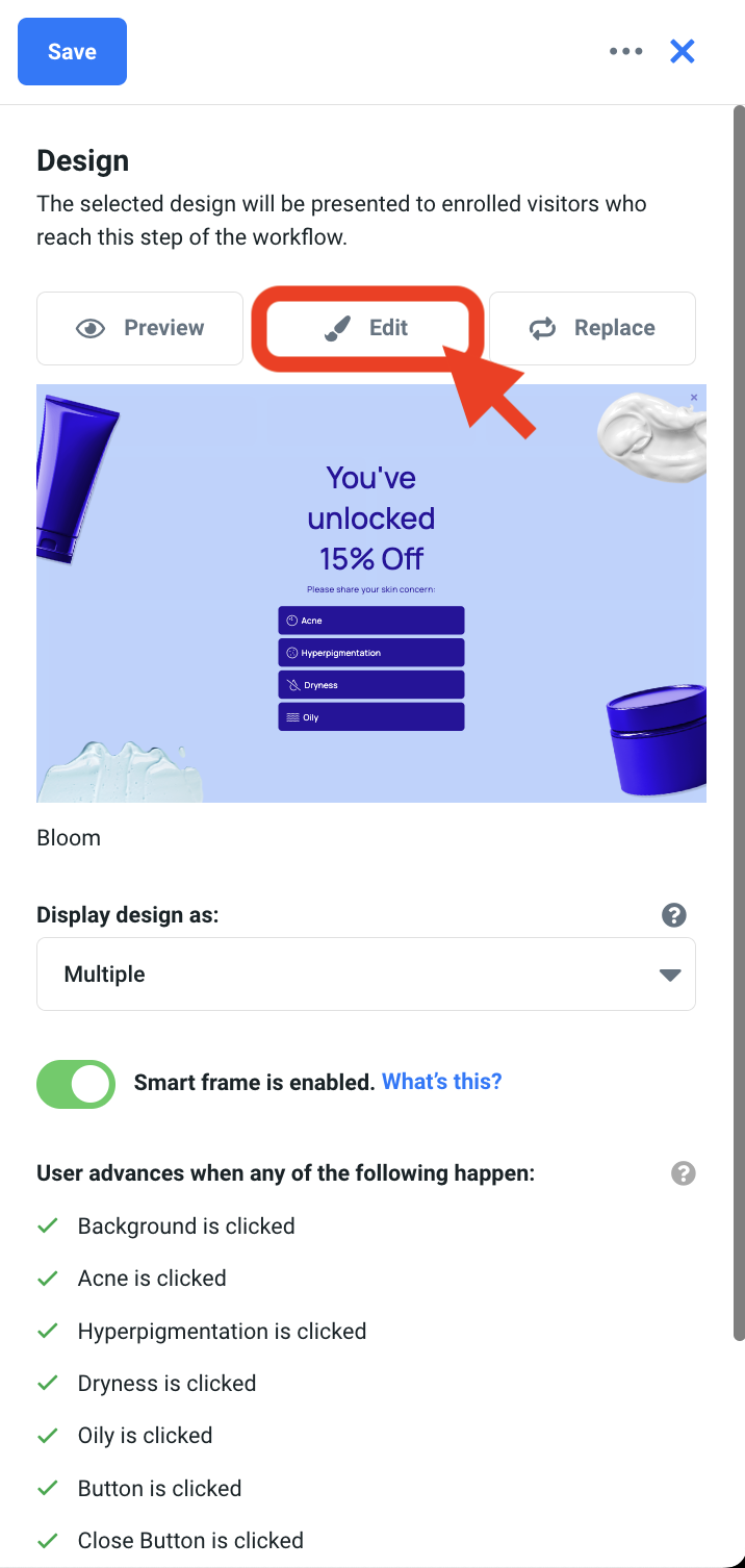 - Inside the Workflow Builder, click on the Design step to reveal the design step module. Click Edit to enter the Design Studio.