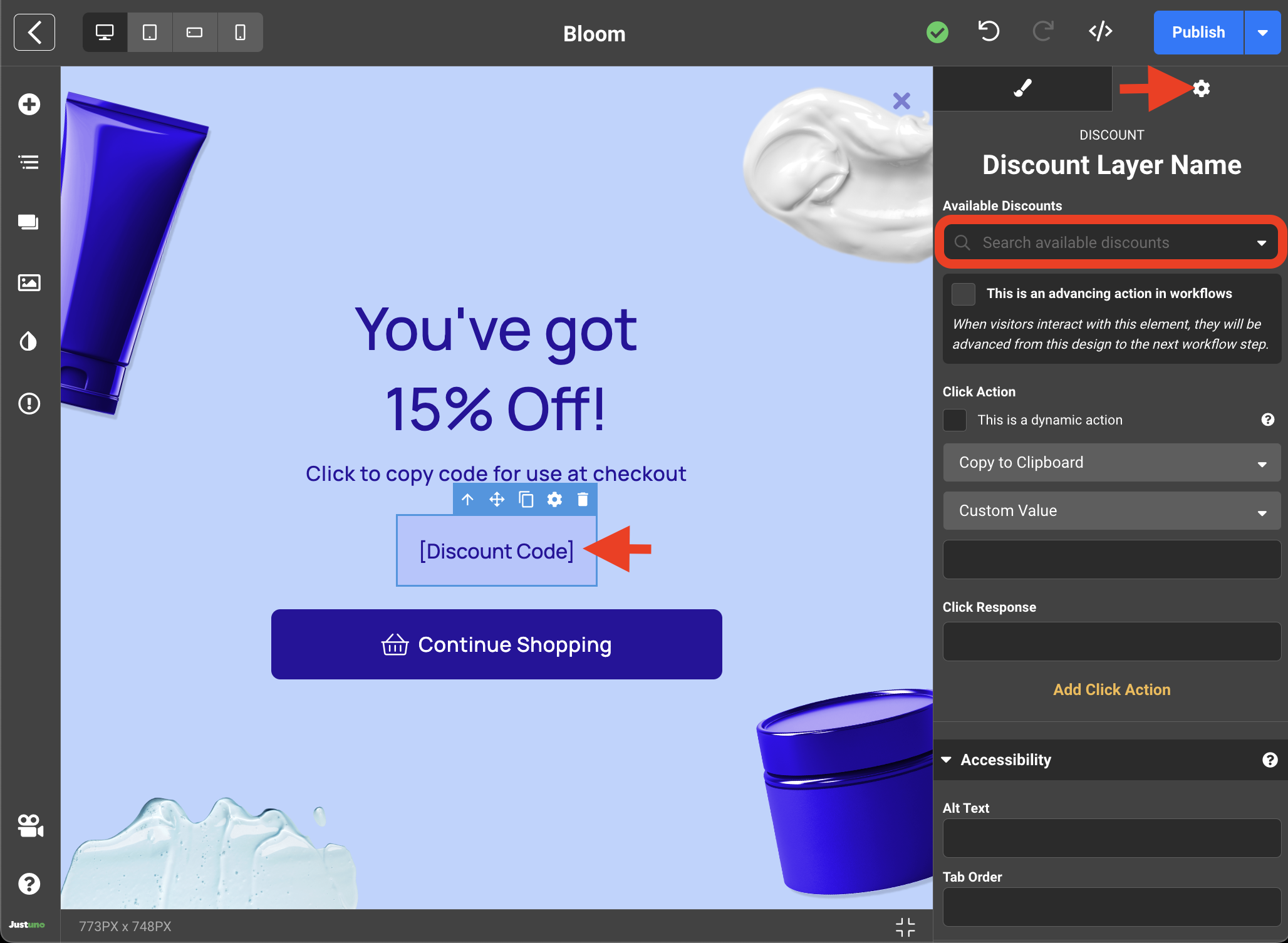 - Lastly, we need to add our Discount Code. On the Follow up frame you will find a Discount Code element. Select the Discount Code element and navigate over to the Settings tab on the right side menu (indicated by gear icon). Here you will find a drop down menu labeled Available Discounts. Search or add the discount you would like to display.