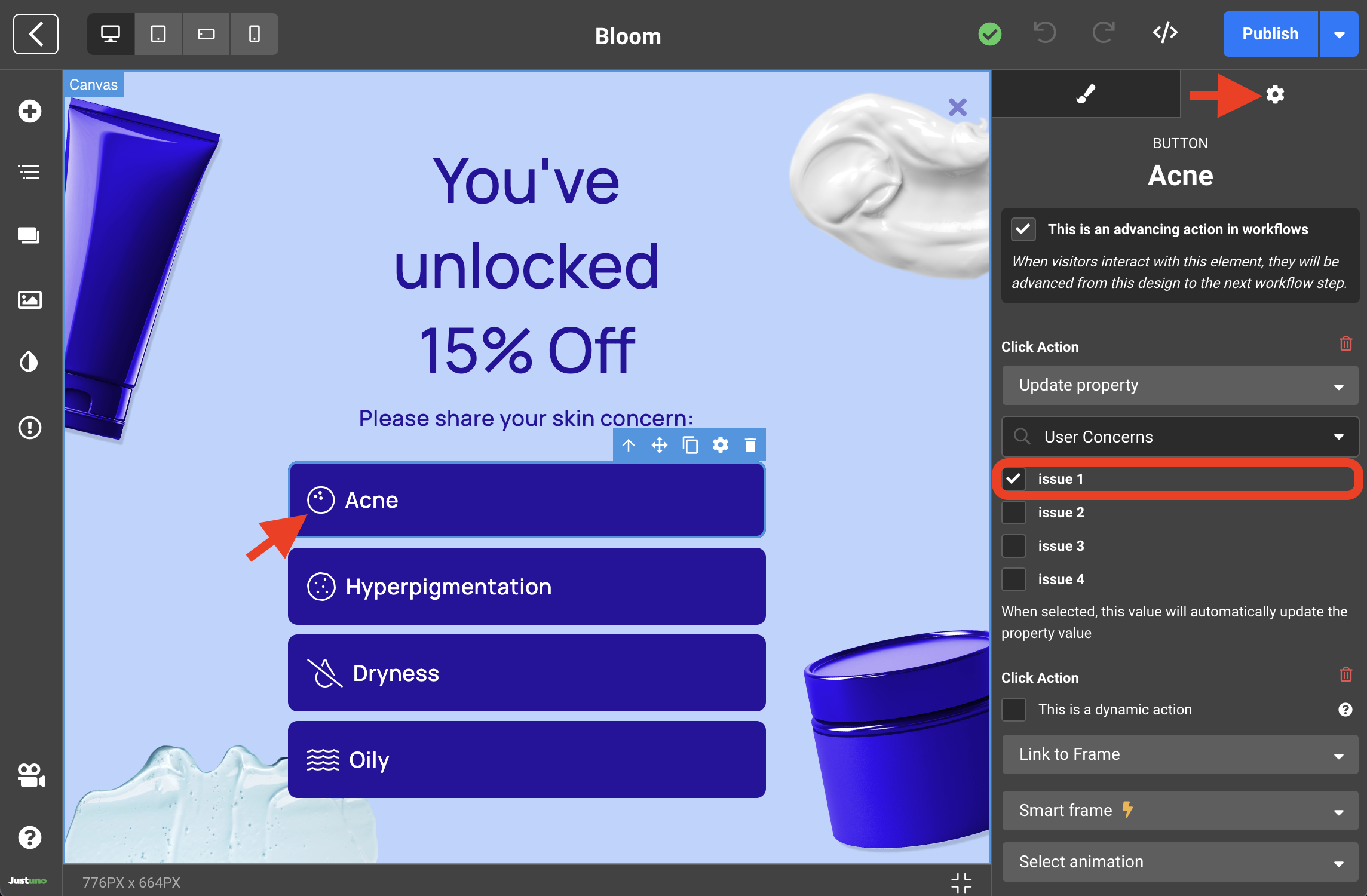 By default, each of four buttons will correspond to one of four options listed under the User Concerns property. This means that if a user clicks on the 'Acne' button, Justuno will tag that visitor with 'issue 1'.