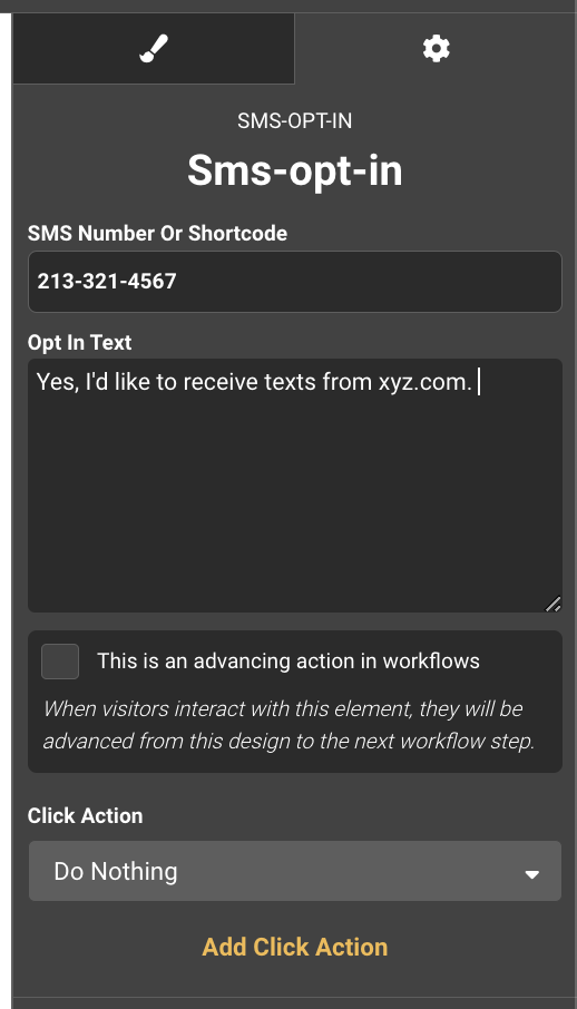 2. Update the settings for the element by adding in your SMS Number or Shortcode and the opt-in text with your keyword included.