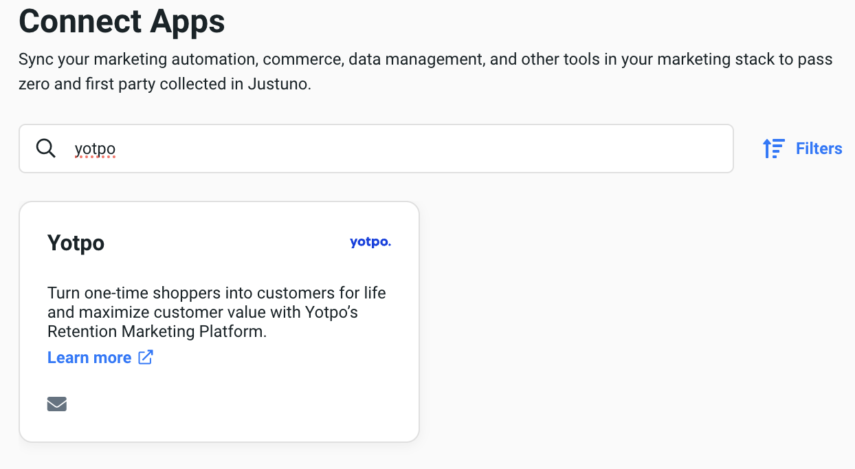 - Users will also be able to connect and disconnect the application from Yotpo's side. Connecting from Yopto will simply redirect the user to Justuno's app marketplace to connect.