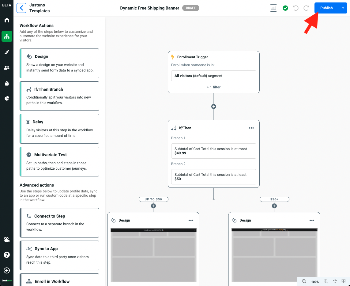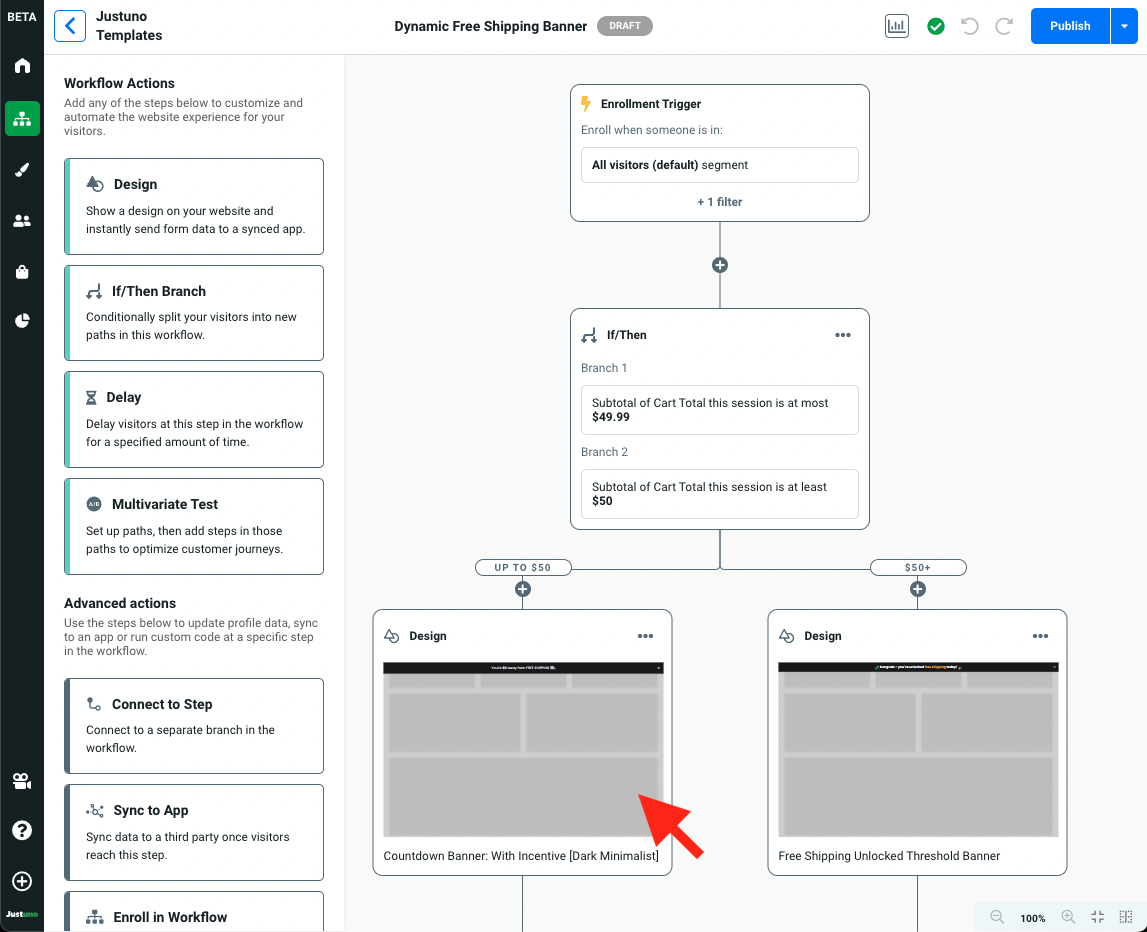 NOTE: By default, this workflow is setup to trigger the Countdown Banner... if the visitor has a subtotal in cart <$50. Once the $50 threshold is hit, the secondary Free Shipping Unlocked... banner is revealed in its place