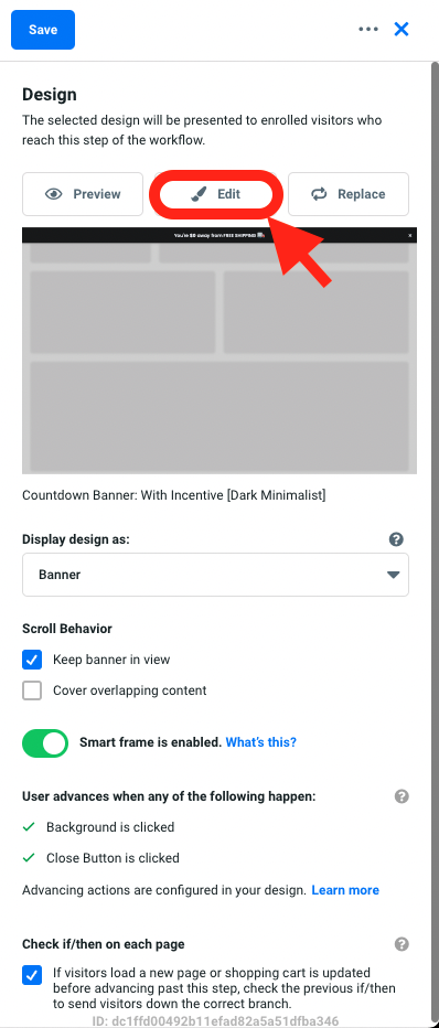 - Inside the Workflow Builder, click on the Design thumbnail on the left branch named Countdown Banner... The design step module will appear from the right. Click Edit to enter the Design Studio.
