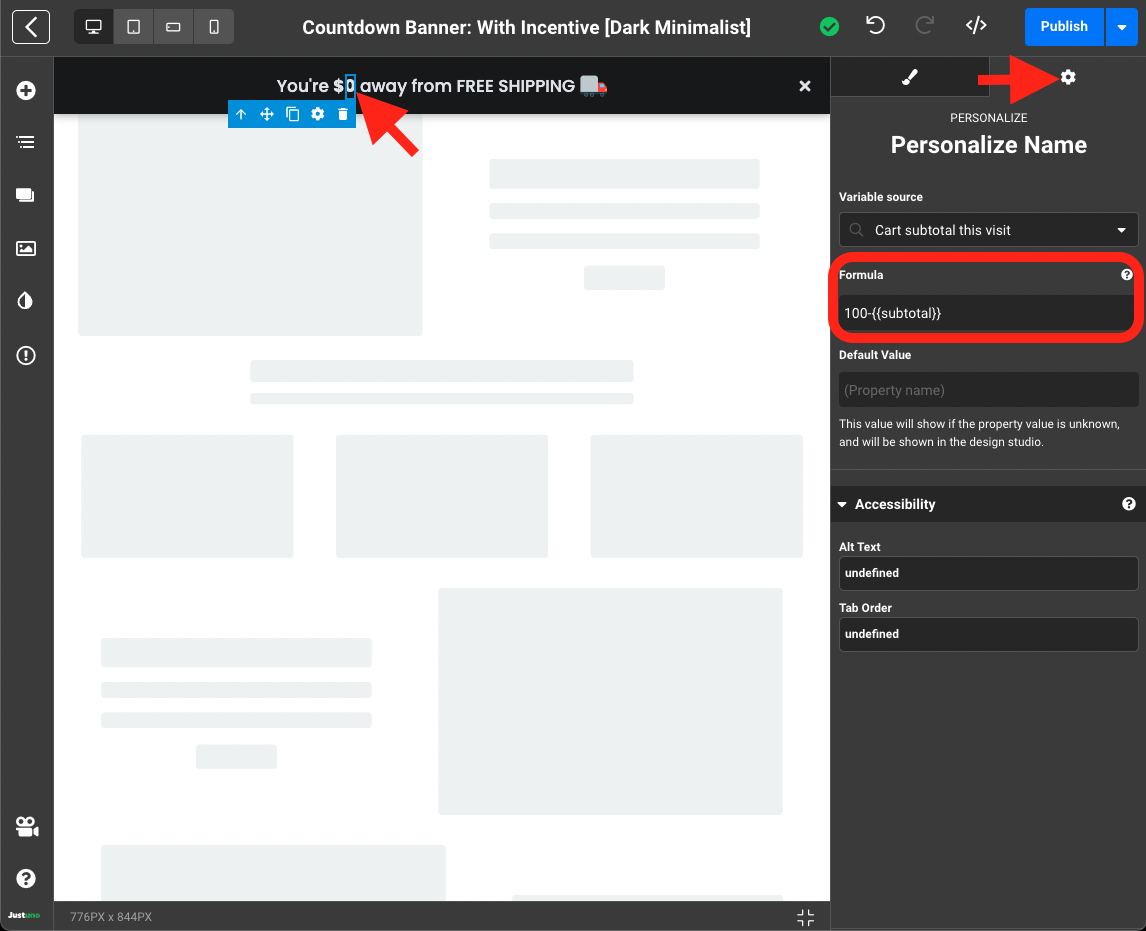 - Inside the Design Studio, select the 0 value in the design and navigate to the settings tab on the right side menu. By default, the formula input is 100 - { { subtotal } } . This means Justuno will take the subtotal amount in cart and subtract it from 100. That difference will be shown in place of the 0 value. Replace the 100 value in this formula with your desired free shipping threshold value.