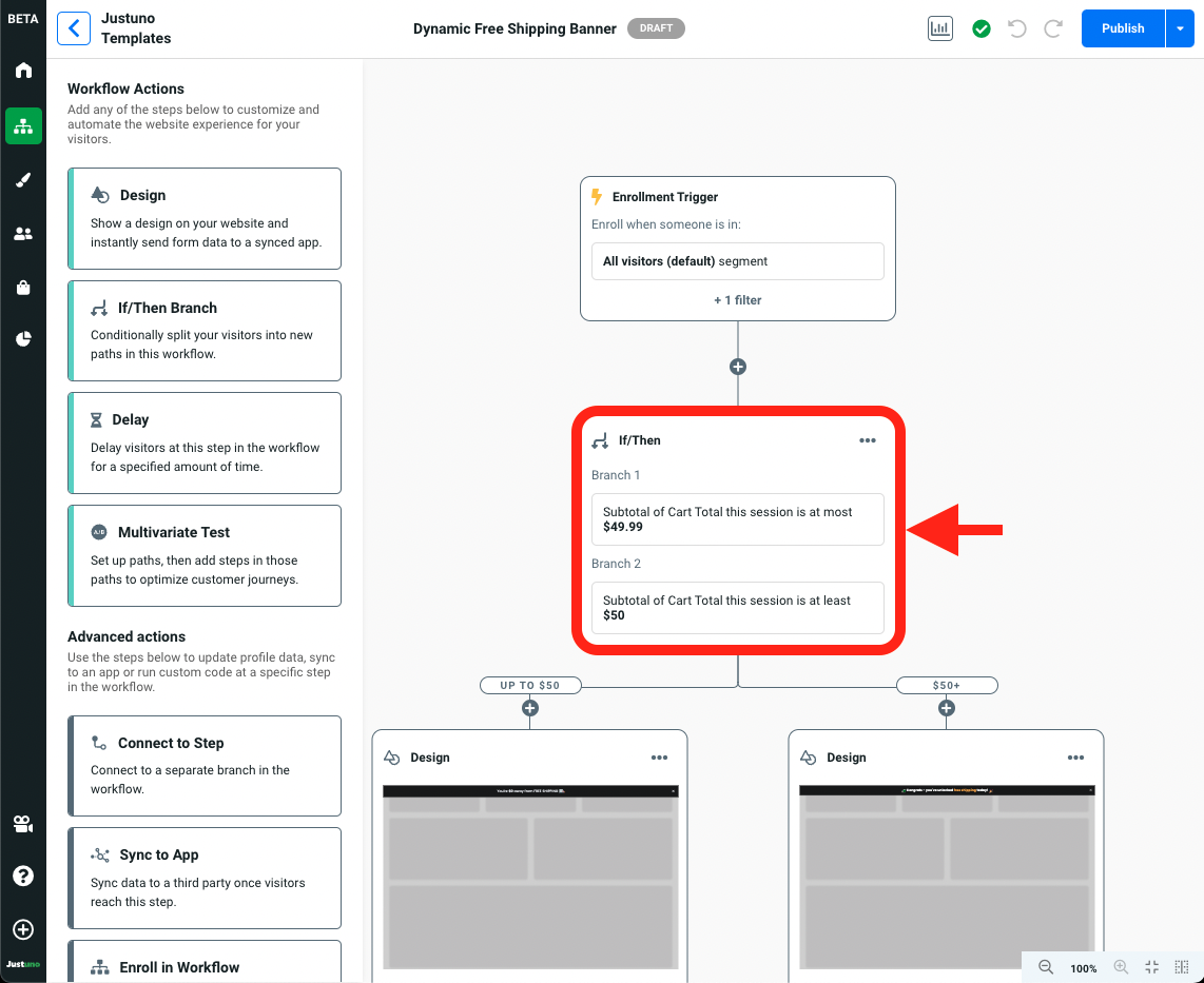 - Select the following $50+ branch and repeat the step above. This time, input the minimum value needed to show the Free Shipping Unlocked banner (e.g. if visitors qualify for free shipping after spending $100 you would input 100).