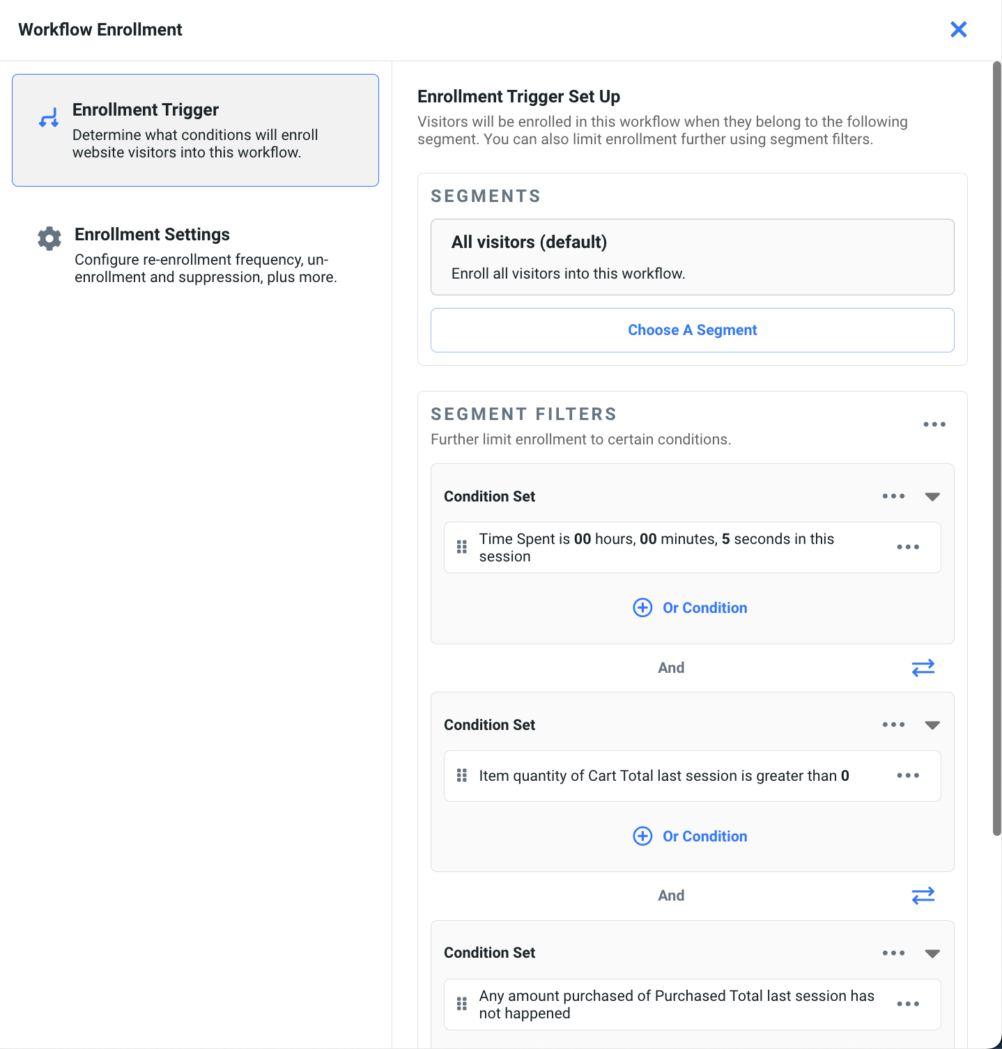 Your enrollment trigger controls the target audience for your workflow. By default, the Returning Cart Abandonment Reminder targets: