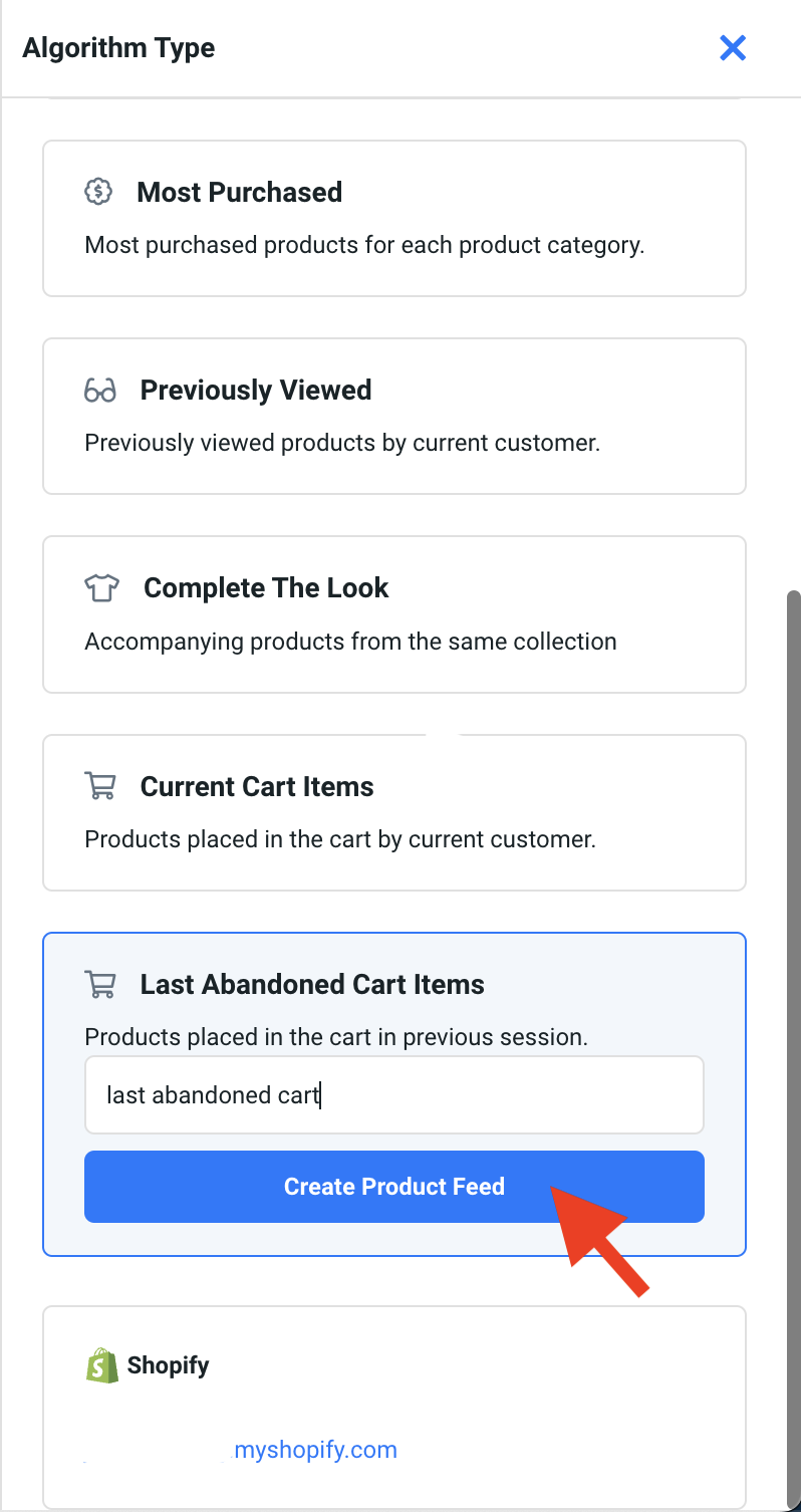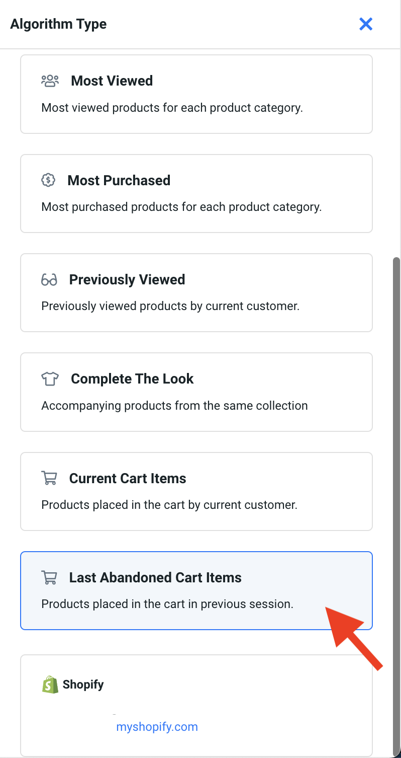 If you are unable to locate the Last Abandoned Cart algorithm in the drop down menu, you will need to click on Create A New Algorithm: