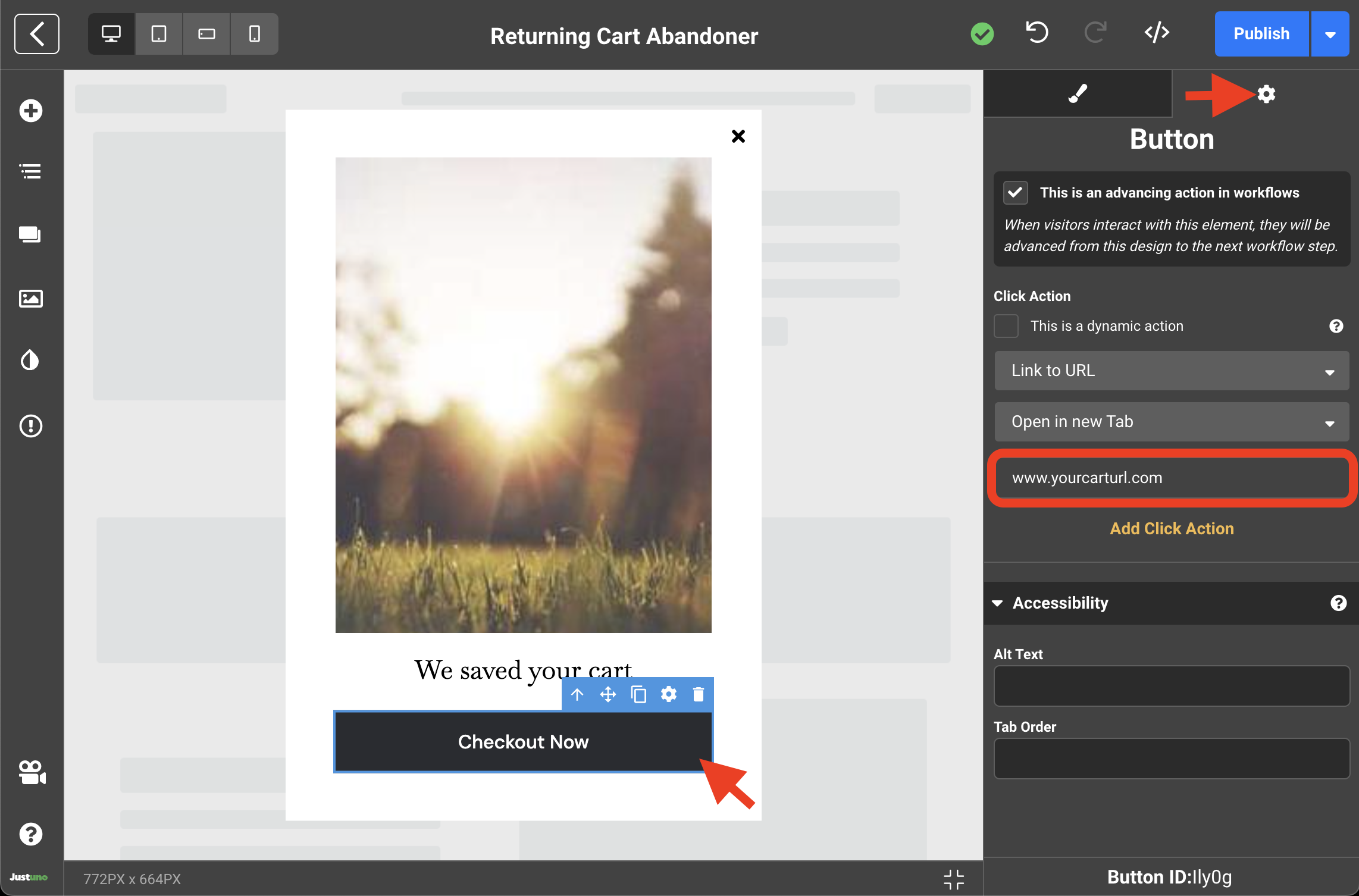 - Next, we need to set a destination url for the Checkout Now call to action button. Select the button and navigate to the settings tab on the right side menu. Input your cart/checkout URL in the url placeholder field.