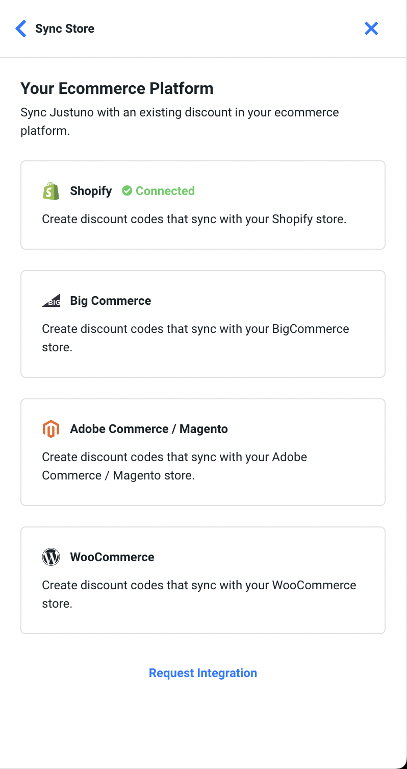 Alternatively, you may choose to use synced discounts which are unique codes generated by Justuno based on an existing discount within your e-commerce platform. When installing Justuno via an app store, your account should automatically sync any existing codes. You’ll see this via a “connected” indicator next to your platform option.