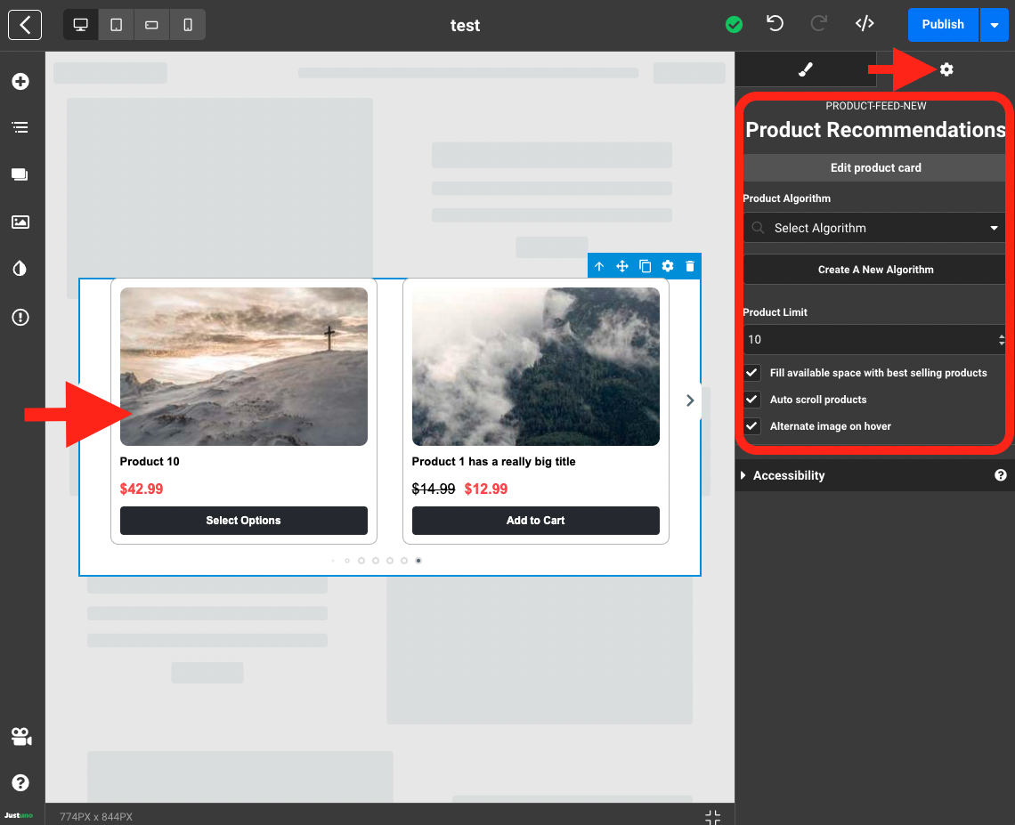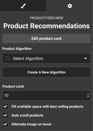 To edit the product recommendation element, select the product recommendation element in your design and click on the settings icon on the right sidebar. Here you will find a handful of customization inputs.