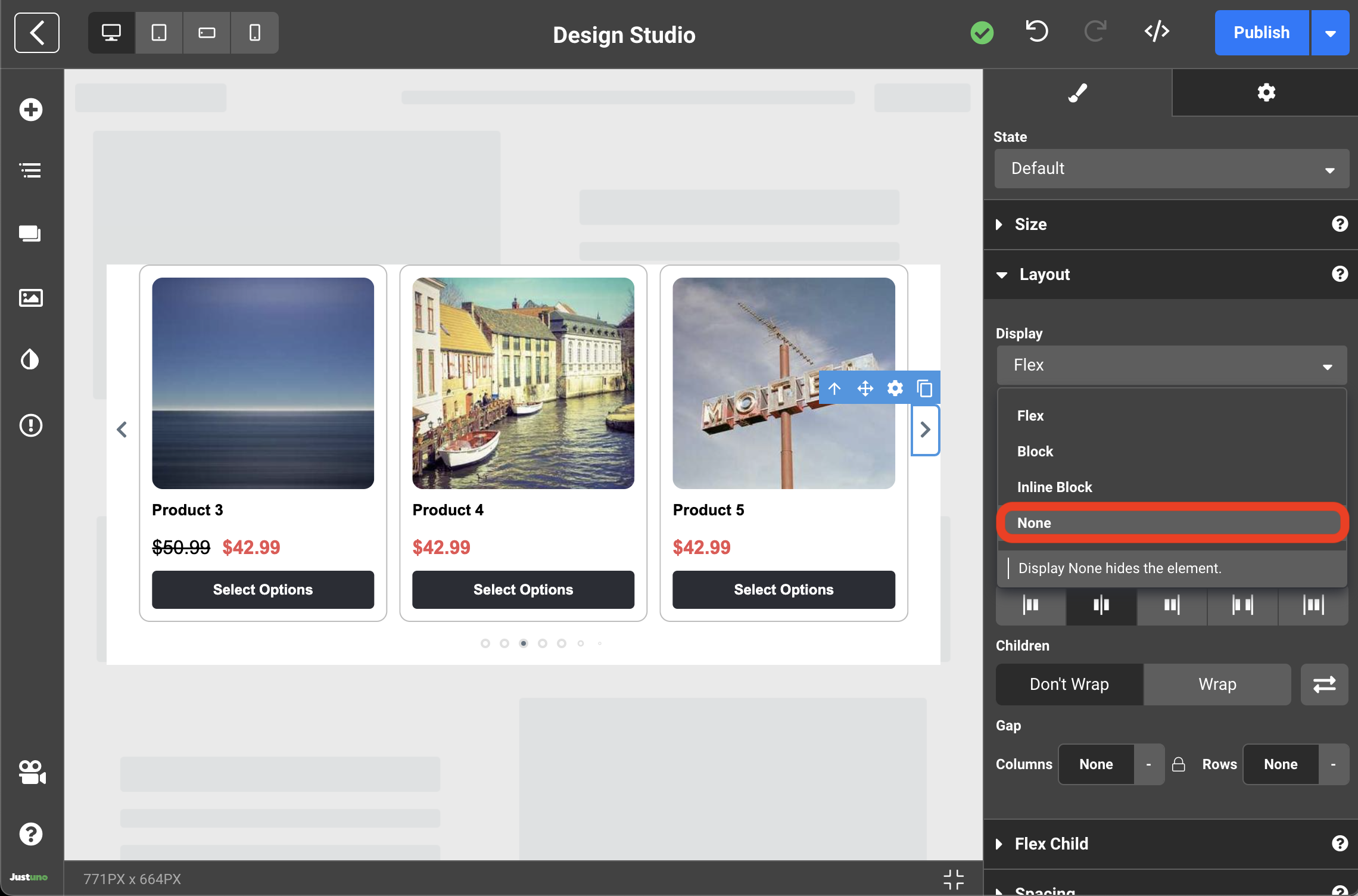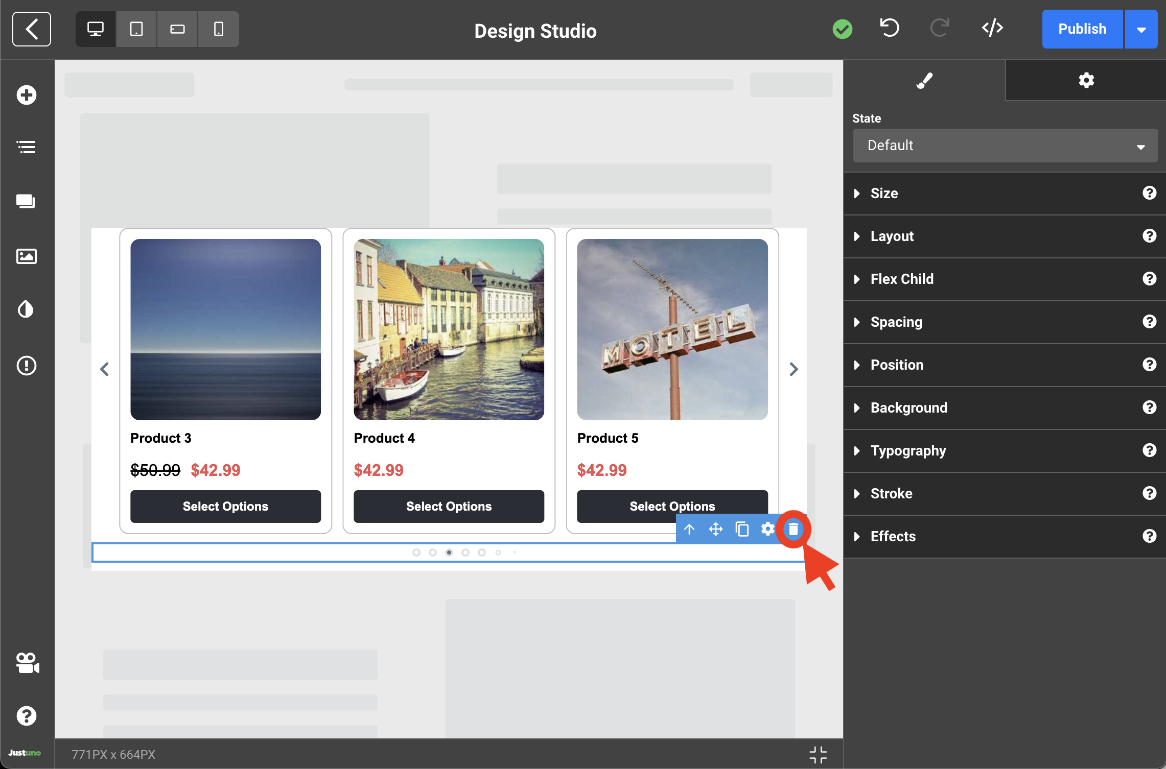 NOTE: The native side arrows and bottom carousel nav operate as individual elements and can be stylized independently. They can also be removed by setting Layout>Display>None, or clicking the trash icon when applicable.