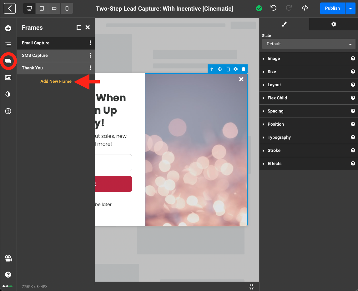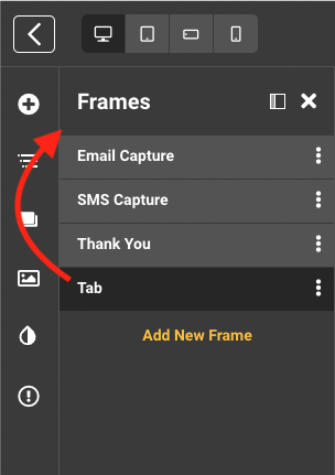 - Jump into the design for which you'd like to implement a Tab Button. Navigate to the Frames section in the left side menu and select Add New Frame.