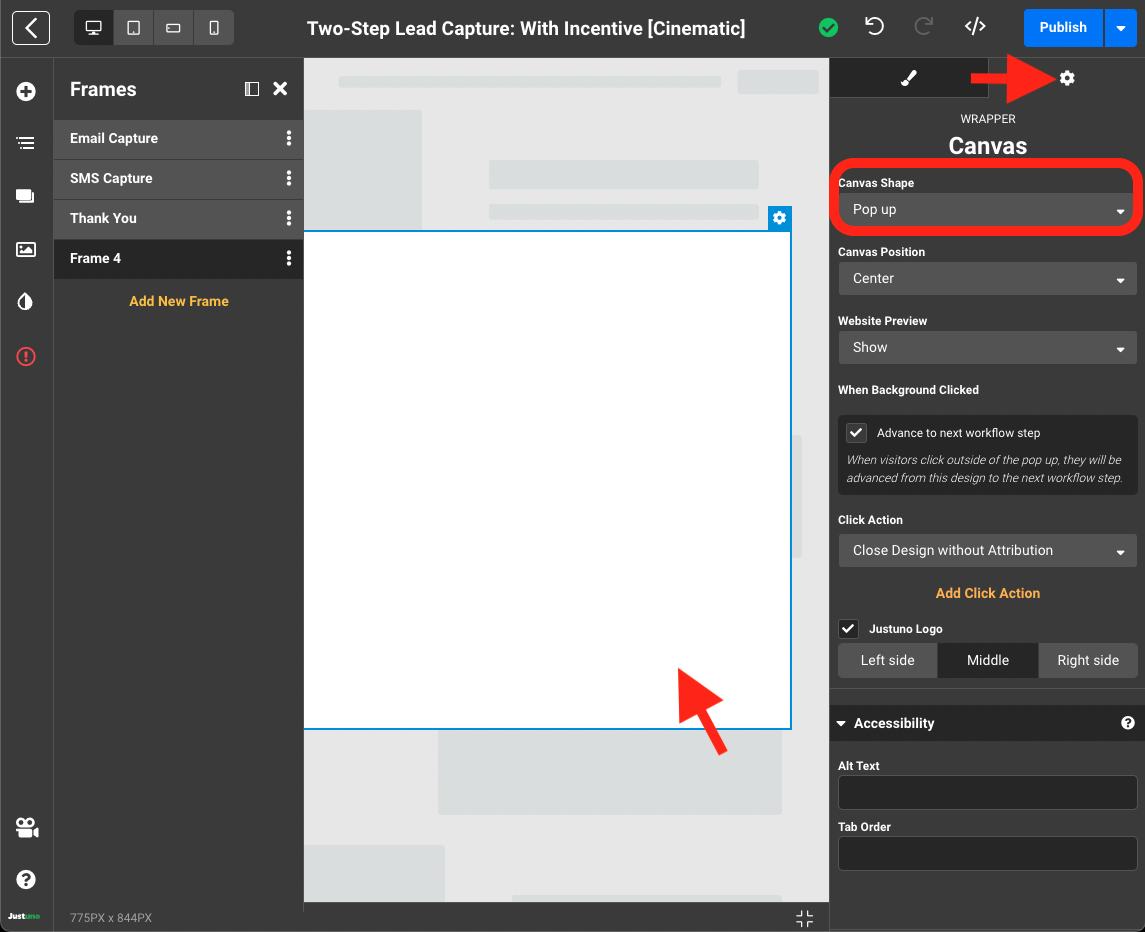 - Once you've added a new frame, select the blank canvas and navigate to the settings tab on the right side menu. In the Canvas Shape drop down menu, find and select Tab.