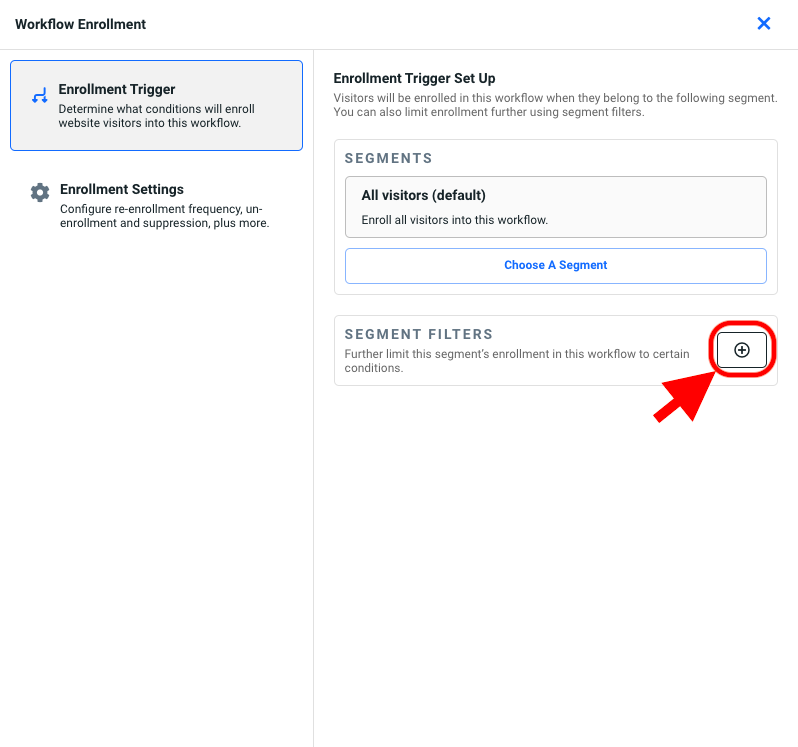 - Inside the Workflow Enrollment panel, select the addition button to add a Segment Filter.