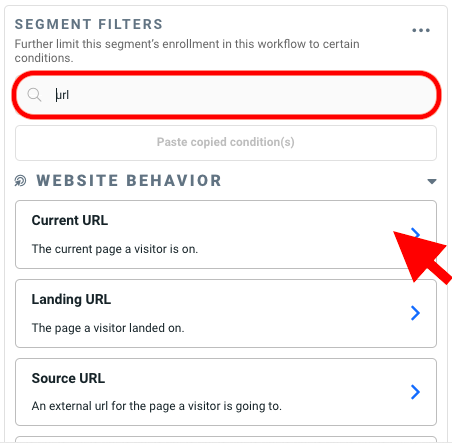 - In the search bar, type URL and select Current URL in the search results below.