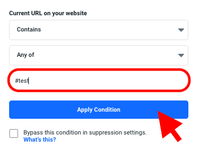 - Confirm the selection fields matches as follows. In the value field input #test and tap Apply Condition.