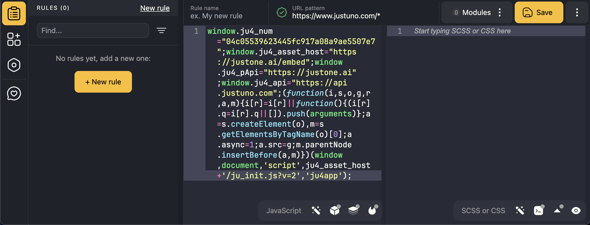 - Inside the New rule panel, select and paste your Justuno embed code into the field labeled Start typing your JavaScript here. You'll also want to remove the <script> tags in the beginning and end of the embed code. The resulting code will look something like this: