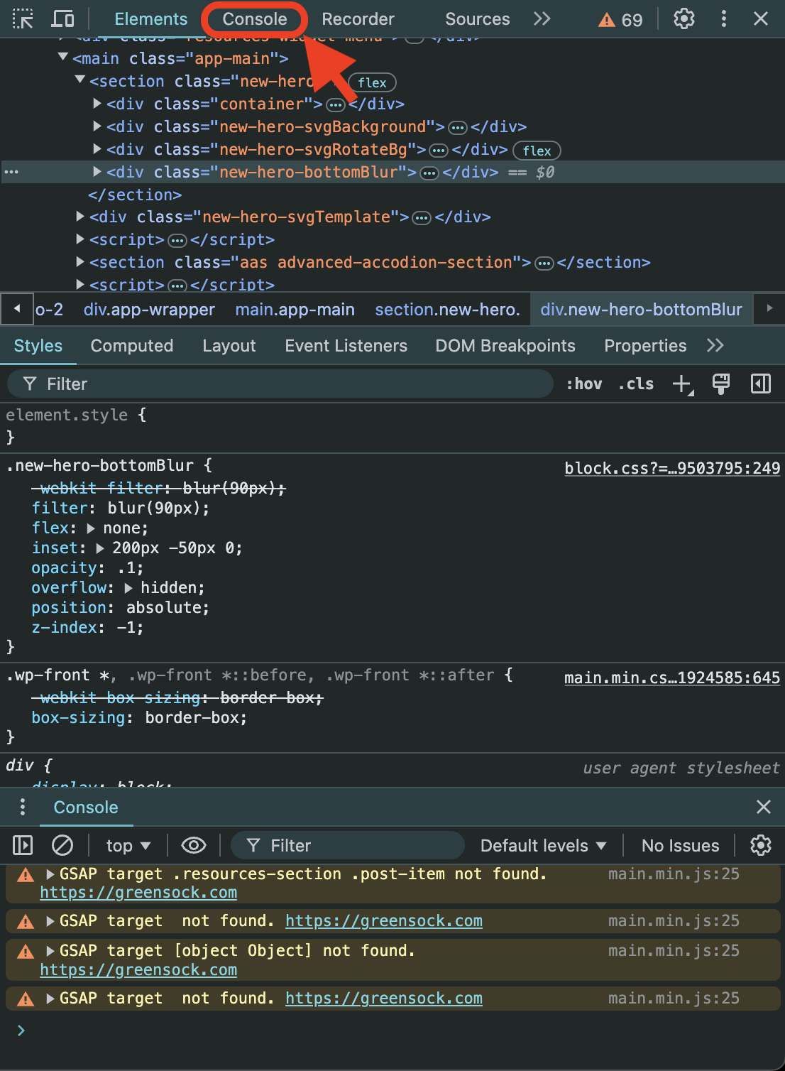 - In the panel that appears, locate and select the Console tab.