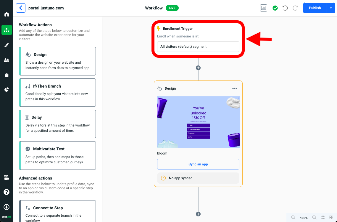 - Enter the workflow of the desired experience you'd like to test. Tap on the Enrollment Trigger step.