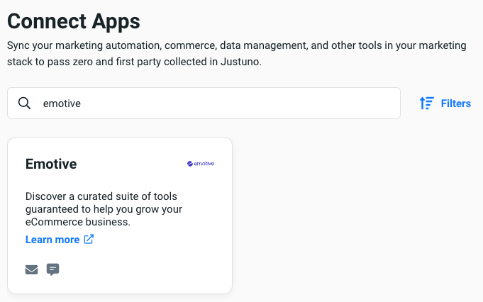 Emotive SMS automates conversational, 2-way SMS at scale for e-commerce businesses. With Emotive SMS you can build your SMS audience compliantly, segment your customers and automate messages or promotions, and drive revenue and measure success with attribution analytics and reporting. This article will cover the integration related to Emotive's SMS product. Once connected, users can automatcially pass any new contacts and associated data collected by Justuno to a specified list within Emotive.