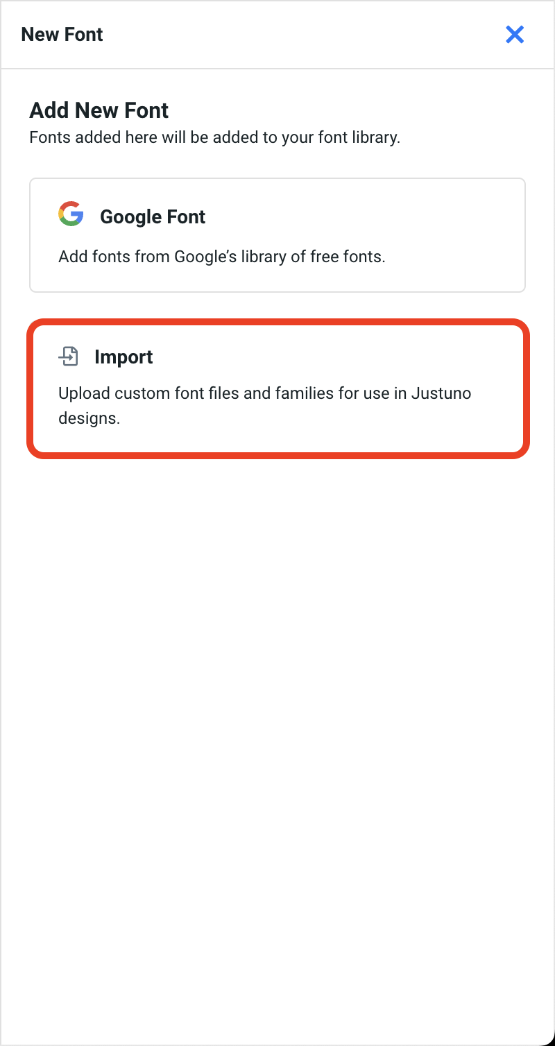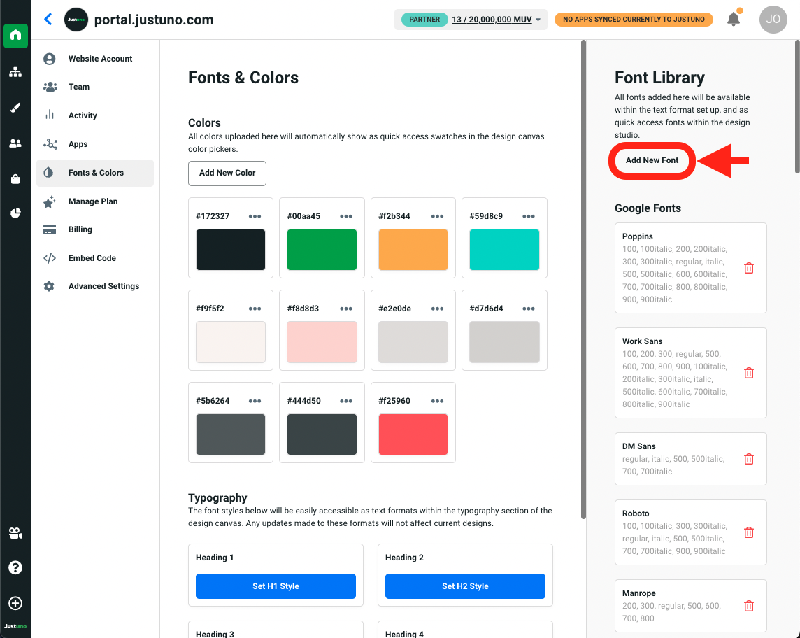 Fonts are generally accessed in the Font & Colors area within your Justuno account settings, or inside the Typography area within the Design Studio. This is also where you will find the option to Add New Font.