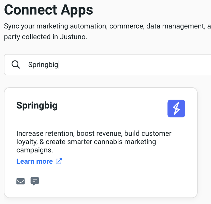 Springbig is the leading provider of cannabis marketing platforms and dispensary loyalty programs. They provide compliant text marketing solutions for regulated industries as well as an entire suite of marketing automation, native apps, referral programs, CRM, and data solutions. This integration allows Justuno to feed visitor data of your choice to Springbig to then be used in any segmentation or campaign building.
