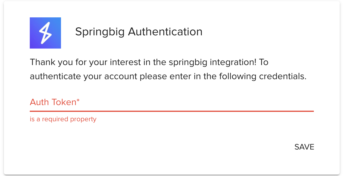 As soon as you click on Springbig you'll be prompted to enter your authentication token.