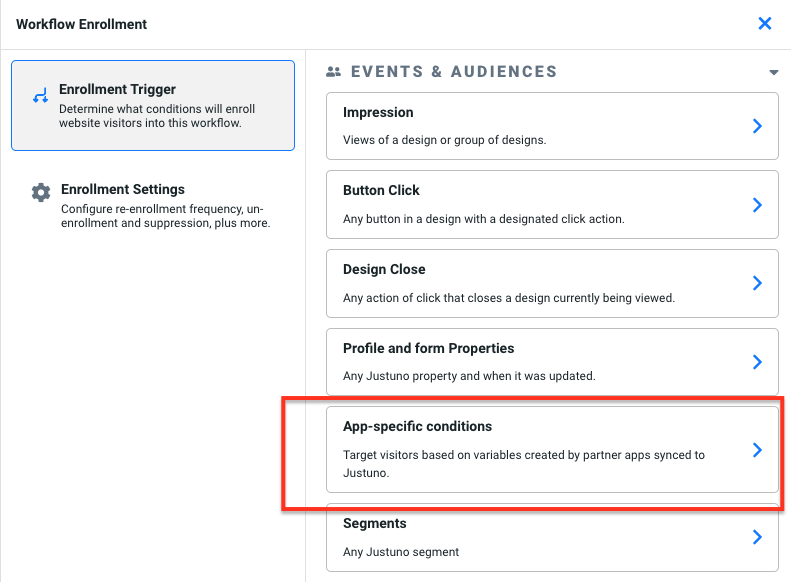 6. Under the "Events & Audiences" section select "App-specific conditions"
