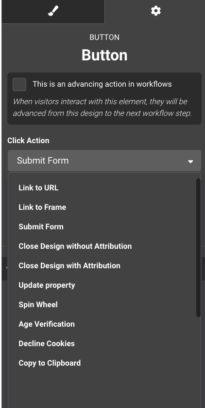 - With the Button element selected, navigate to the settings tab on the right side menu and find the Click Action drop down menu.