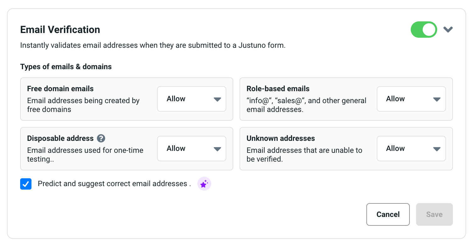 Justuno by default, will always validate that an email address is semantically correct. But sometimes you may want to ensure the email address entered is an actual working email or that it is not a type of temporary or throwaway email. You may also want to try to catch misspelled common domains in emails. This is where Justuno's advanced email validation & verification features come into play.